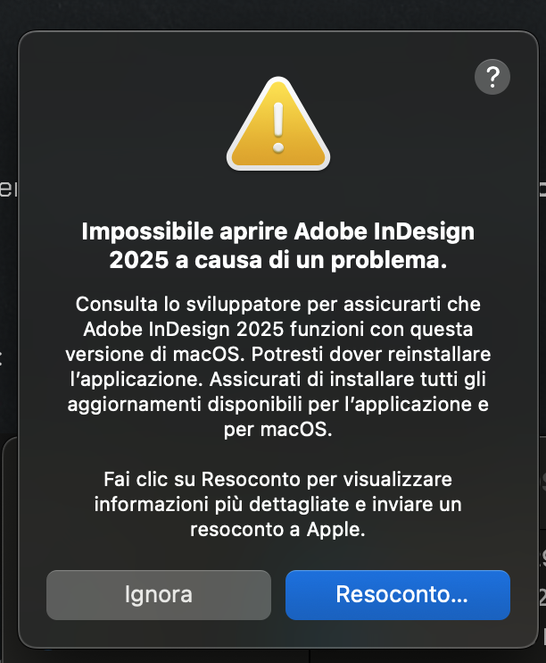 ok è chiaro che non trova correttamente la libreria dinamica, su google ci sono varie soluzioni: https://www.google.com/search?q=ASLSupportLib.dylib+indesign+error&oq=ASLSupportLib.dylib+indesign+error&gs_lcrp=EgZjaHJvbWUyBggAEEUYOdIBBzE2MmowajGoAgCwAgA&client=ubuntu-chr&sourceid=chrome&ie=UTF-8 provane alcune e risolverai