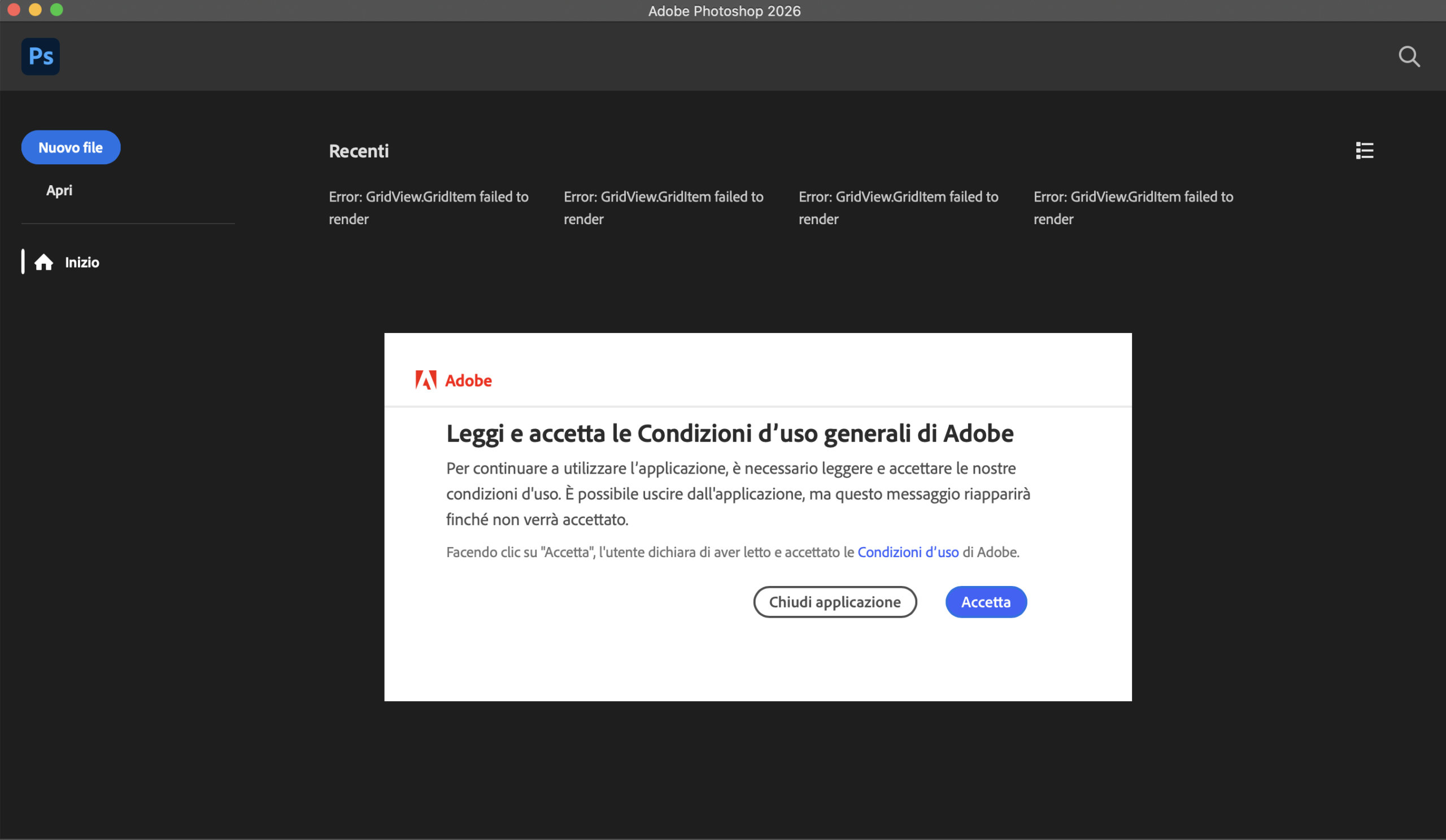 Ciao, ad ogni apertura dell’applicazione appare questo messaggio e quando seleziono “Accetta” PS crasha.