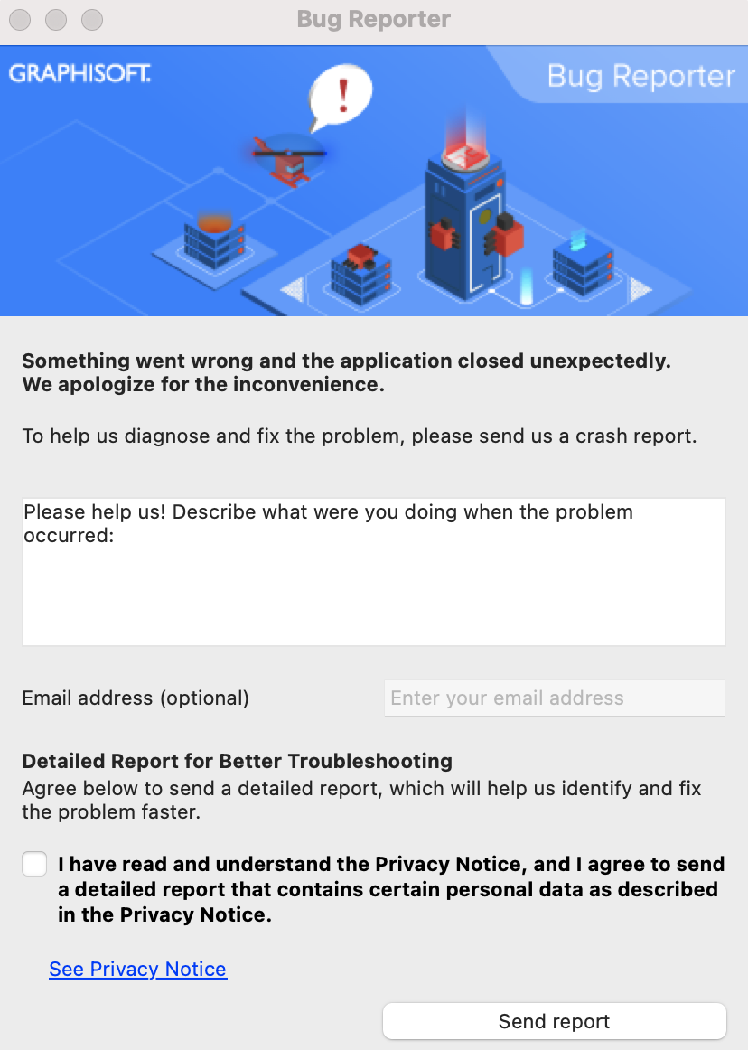 non so se si vedranno gli allegati, in ogni caso é il bug reporter di graphisoft in cui chiede di descrivere il problema.