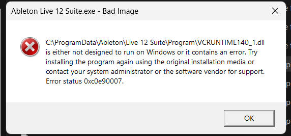 Ciao, dopo aver spostato il dll nella cartella ottengo questo errore quando provo ad aprire ableton. Ho provato a scaricare sia da Mirror 1 che dal 2, disinstallando ableton prima di usare l’installer fornito. Ho anche cliccato “unlock” nelle proprietà del dll. Sto usando Windows 11.