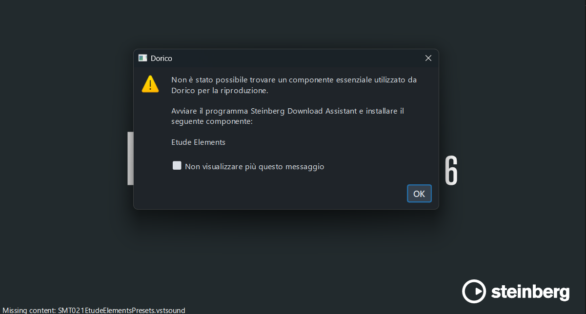 ciao, prova a leggere qui: https://www.reddit.com/r/Dorico/comments/1nv46zw/missing_essential_component_etude_elements_after/